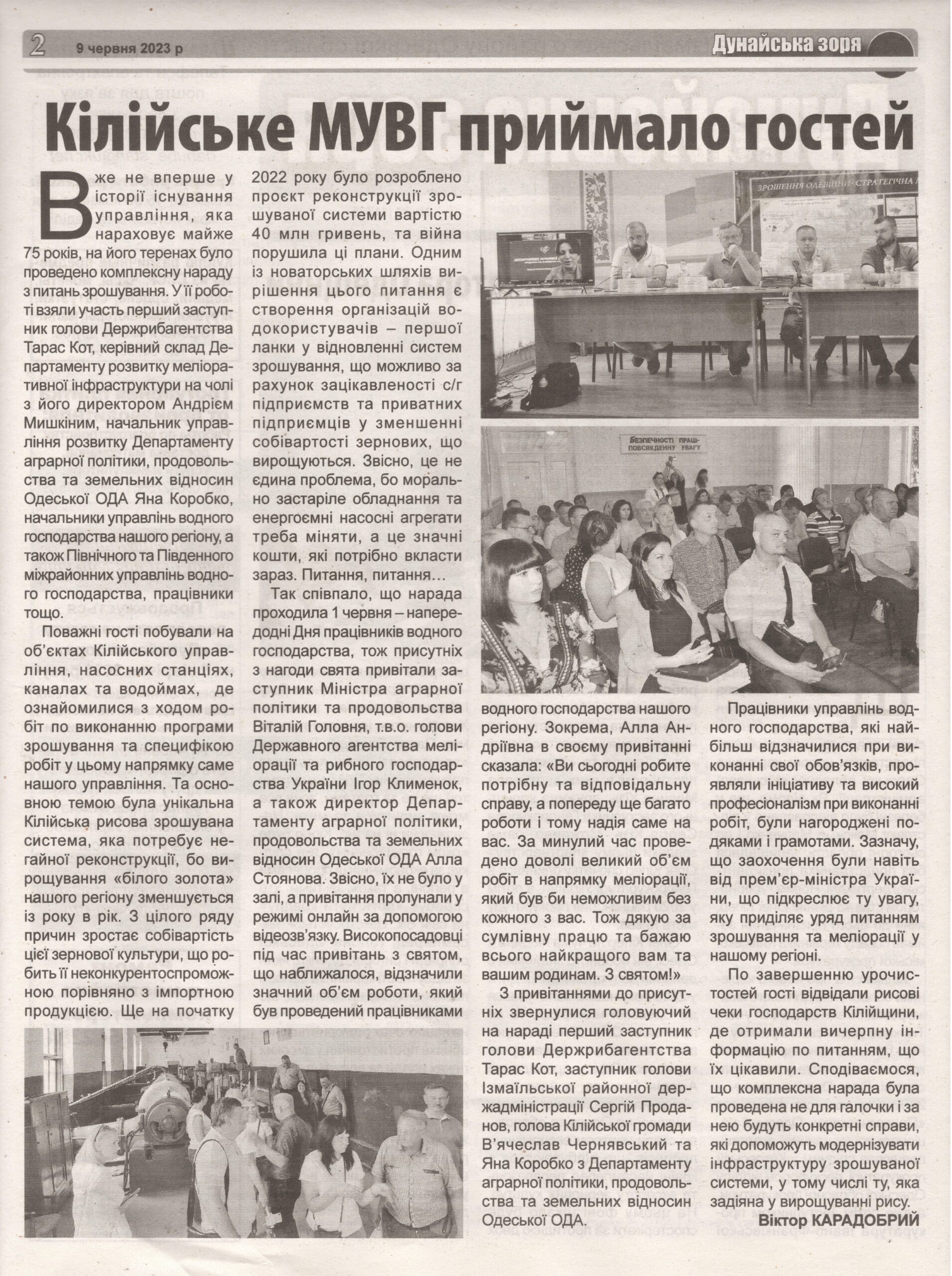 30 березня 2023 року в приміщенні Одеської обласної державної (військової )адміністрації відбулась робоча нарада з водокористувачами Одеської області, щодо стану реформи галузі меліорації та готовності зрошувальних систем до поливного сезону 2023 року.